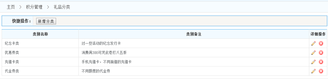 禮品分類列表:展示系統(tǒng)中設(shè)置的所有的禮品分類