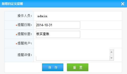增加自定義提醒(提醒日期、提醒標(biāo)題、提醒人、提醒詳情)
