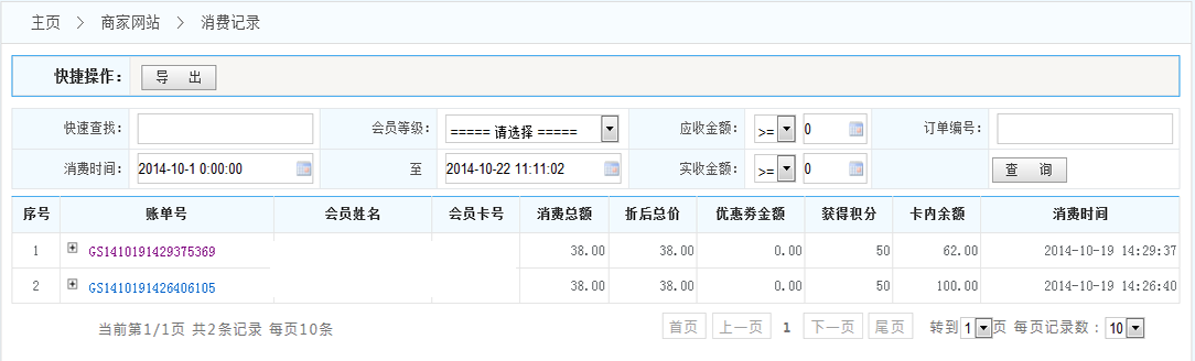1.導(dǎo)出:將按條件查詢到的消費賬單數(shù)據(jù) 導(dǎo)出成Excel表格