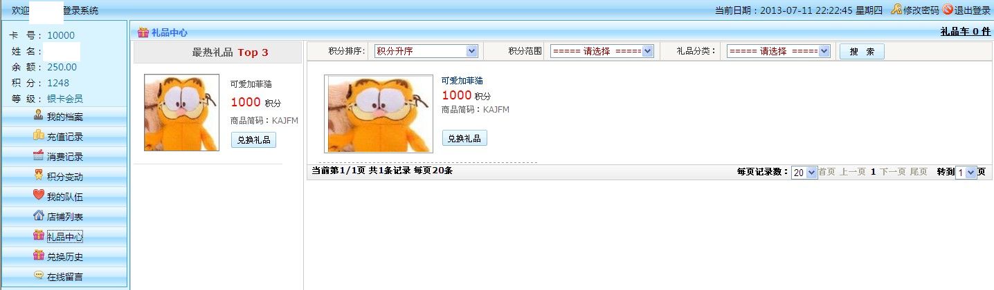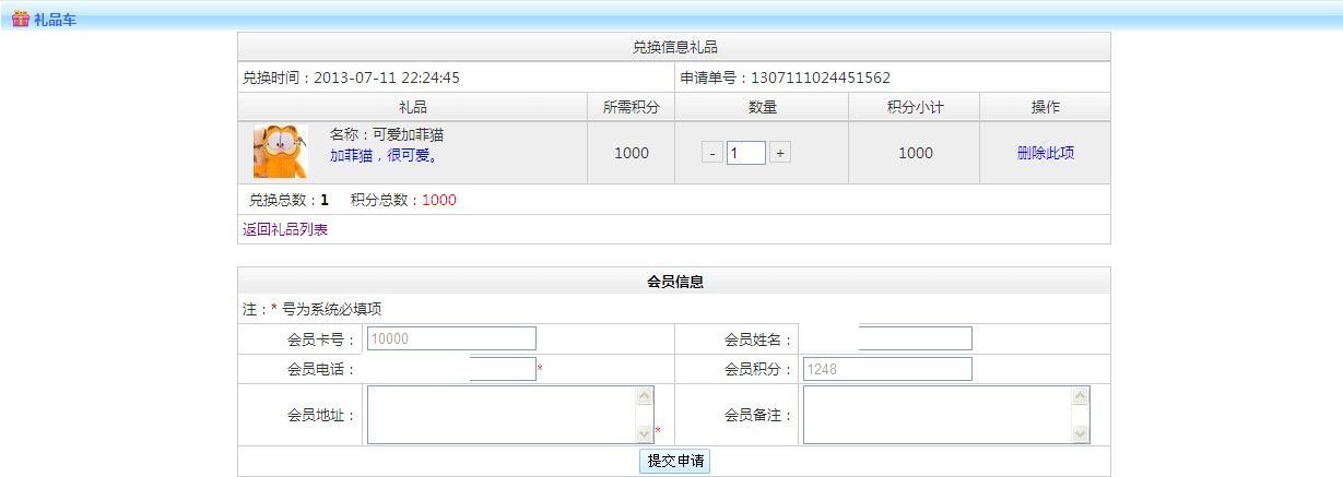 點擊兌換禮品添加到購物車內 點擊購物車1件 跳轉到兌換信息禮品頁面,填寫會員的地址會員備注信息提交兌換禮品申請!