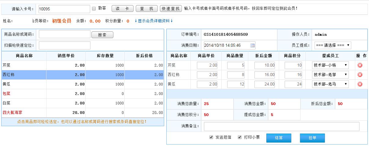 先會員刷卡,然后輸入商品的名稱或簡碼或者掃描槍快速定位查找商品;或者直接點擊商品選擇;選擇商品后點擊結(jié)算此訂單如圖顯示: